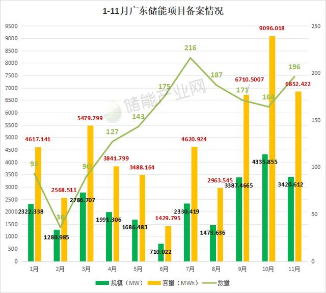 從1-11月廣東儲能項目備案情況來看,11月備案數(shù)量有196個,相較于10月,數(shù)量上有所增加,但儲能項目備案規(guī)模出現(xiàn)下滑,合計為3420.612MW/6852.422MWh,規(guī)模下降的主要是因為大型儲能電站項目的減少,大部分為用戶側(cè)工商業(yè)儲能項目。