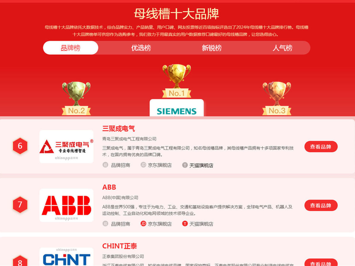 近日,2024年度母線槽十大品牌由發(fā)布,三聚成電氣、施耐德電氣、ABB、西門子等榮耀上榜。據了解,本次母線槽十大品牌排行榜,經過統(tǒng)計有10家品牌成功入選中國母線槽十大品牌排行榜,經過網民投票和專家的綜合評估,最終確定了母線槽十大品牌名單: