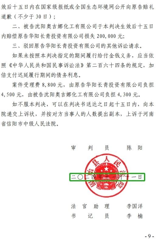 5、2024年10月30日,奧吉娜公司收到固始縣法院日期為2024年10月28日的《民事判決書》(2024)豫 1525 民初 6011 號(hào)。判決長(zhǎng)青公司勝訴如下:“一、被告沈陽(yáng)奧吉娜化工有限公司立即停止對(duì)原告華陽(yáng)長(zhǎng)青投資有限公司的舉報(bào)、投訴等名譽(yù)侵權(quán)行為,并于本判決生效后十五日內(nèi)在國(guó)家級(jí)報(bào)紙或全國(guó)生態(tài)環(huán)境網(wǎng)公開向原告賠禮道歉(不少于 30 日); 二、被告沈陽(yáng)奧吉娜化工有限公司于本判決生效后十五日內(nèi)賠償原告華陽(yáng)長(zhǎng)青投資有限公司損失200,000 元; 三、駁回原告華陽(yáng)長(zhǎng)青投資有限公司的其他訴訟請(qǐng)求。 案件受理費(fèi)8,800元,由原告華陽(yáng)長(zhǎng)青投資有限公司負(fù)擔(dān)4,500元,由被告沈陽(yáng)奧吉娜化工有限公司負(fù)擔(dān)4,300元。”