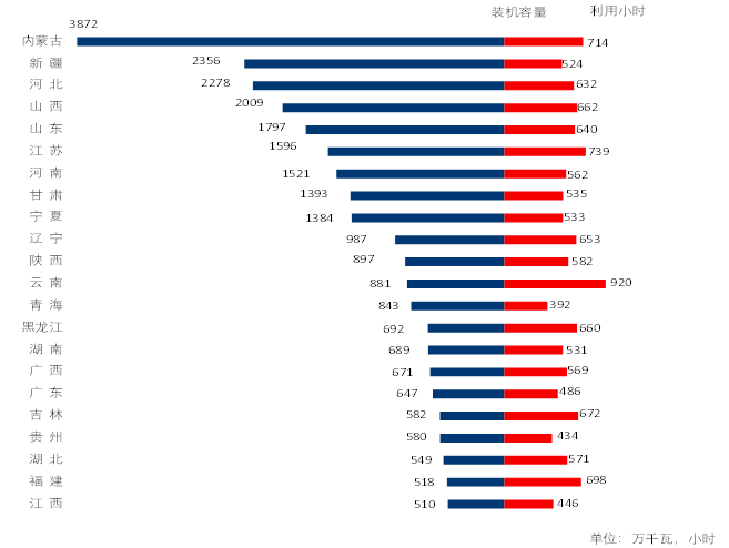 圖3 1-3月份風電裝機較多省份風電裝機容量和設(shè)備利用小時