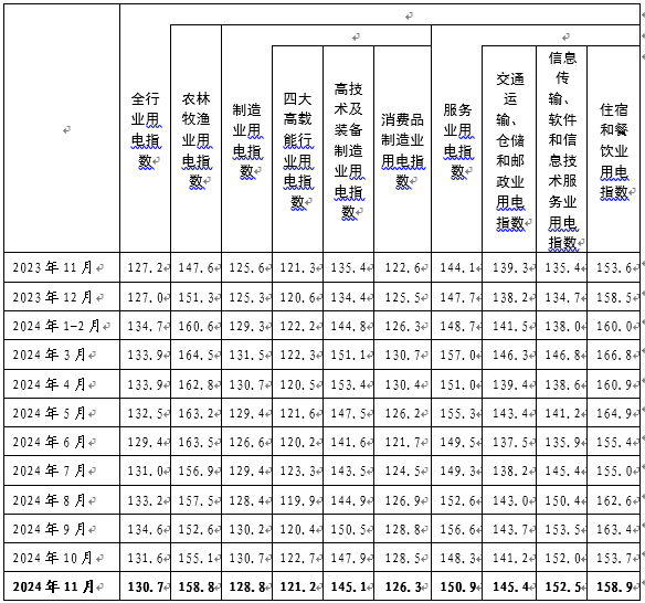 2024年11月,全行業(yè)用電指數(shù)為130.7,全行業(yè)用電量比2020年基期增長了30.7%,年均增長6.9%,同比增長2.8%。