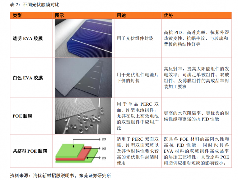 行業(yè)中的主流膠膜原材料共有EVA樹(shù)脂和POE樹(shù)脂兩大類。根據(jù)具體的性能差異,又可分為透明EVA膠膜、白色EVA膠膜、POE膠膜和共擠POE膠膜四大類。