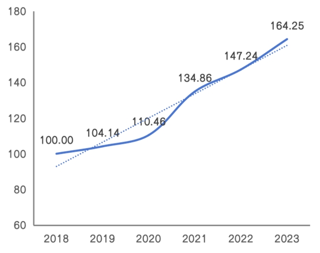 指數(shù)結(jié)果顯示,2023年,內(nèi)蒙古現(xiàn)代能源經(jīng)濟發(fā)展指數(shù)高速增長,達(dá)164.25點,同比增長11.55%,基期以來年均復(fù)合10.43%,發(fā)展質(zhì)速較前期進(jìn)一步提升。從分項指數(shù)看,低碳轉(zhuǎn)型、創(chuàng)新驅(qū)動、經(jīng)濟高效和社會貢獻(xiàn)四大維度發(fā)展均穩(wěn)中向好、好中有進(jìn)、進(jìn)中蓄勢,在錯綜復(fù)雜的國內(nèi)外形勢挑戰(zhàn)下彰顯了內(nèi)蒙古現(xiàn)代能源經(jīng)濟的活力與潛力。