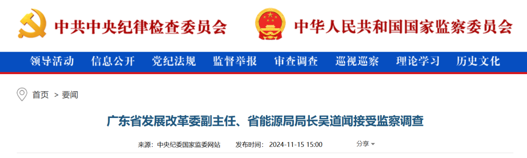 中央紀委國家監(jiān)委網(wǎng)站11月15日消息, 據(jù)廣東省紀委監(jiān)委消息:廣東省發(fā)展改革委副主任、省能源局局長吳道聞涉嫌嚴重違法,目前正接受廣東省監(jiān)委監(jiān)察調(diào)查。