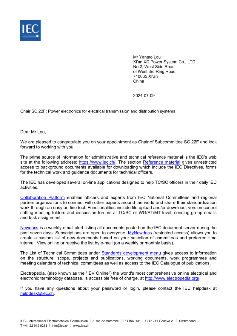 中國電氣裝備代表當(dāng)選國際電工委員會(huì)(IEC )TC22 SC22F主席