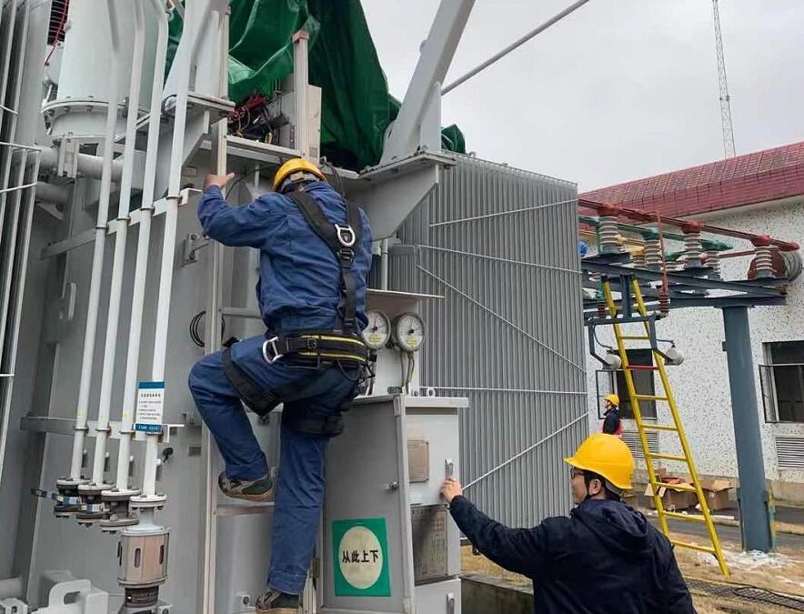 30分鐘后,擔山變110千伏進線、1號主變、10千伏母分開關等I段相關設備全停操作正式開始。此時,擔山變戶外作業(yè)現(xiàn)場,陰雨連綿。操作人員身著雨衣,手提手電,在能見度不高的晨光中,一絲不茍地進行著操作。工作監(jiān)護人、安全督導員在一旁嚴格把關,確保做到安全、質量“雙百分”。一系列操作完成后,運維人員會同工作負責人對現(xiàn)場安全措施進行檢查,對具體的設備指明實際的隔離措施,確保試驗設備無電壓。隨后,工作負責人和工作許可人細心地履行工作許可手續(xù),工作負責人向各工作成員交代工作內容,危險點和預控措施后,開展對擔山變1號主變、I段相關設備的C檢工作……一切都在有條不紊中進行。