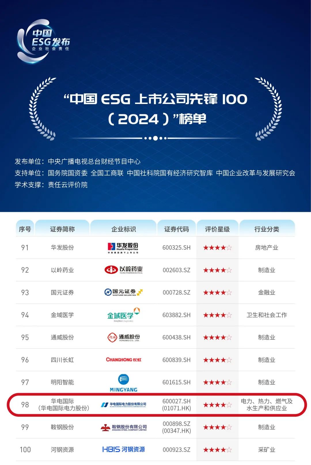 6月30日下午,中央廣播電視總臺(tái)財(cái)經(jīng)節(jié)目中心聯(lián)合國(guó)務(wù)院國(guó)資委、全國(guó)工商聯(lián)、中國(guó)社科院國(guó)有經(jīng)濟(jì)研究智庫(kù)、中國(guó)企業(yè)改革與發(fā)展研究會(huì)在京正式發(fā)布“中國(guó)ESG(企業(yè)社會(huì)責(zé)任)《2024年度ESG行動(dòng)報(bào)告》”?!秷?bào)告》公布了“中國(guó)ESG上市公司先鋒100”榜單,中國(guó)華電所屬華電國(guó)際電力股份有限公司成功入圍。