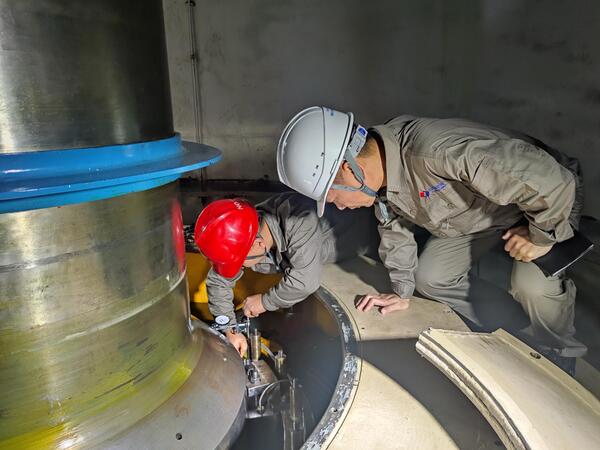 在檢修車(chē)間內(nèi),陳曉輝蜷縮在調(diào)速器主配壓控制柜旁,左手舉著強(qiáng)光手電,右手用內(nèi)六角扳手逐個(gè)緊固連接螺栓。老撾籍維護(hù)員本馬舉著故障記錄本,用中文大聲報(bào)告壓力波動(dòng)數(shù)值:“陳站長(zhǎng),油壓從5.9兆帕降到5.6了!”