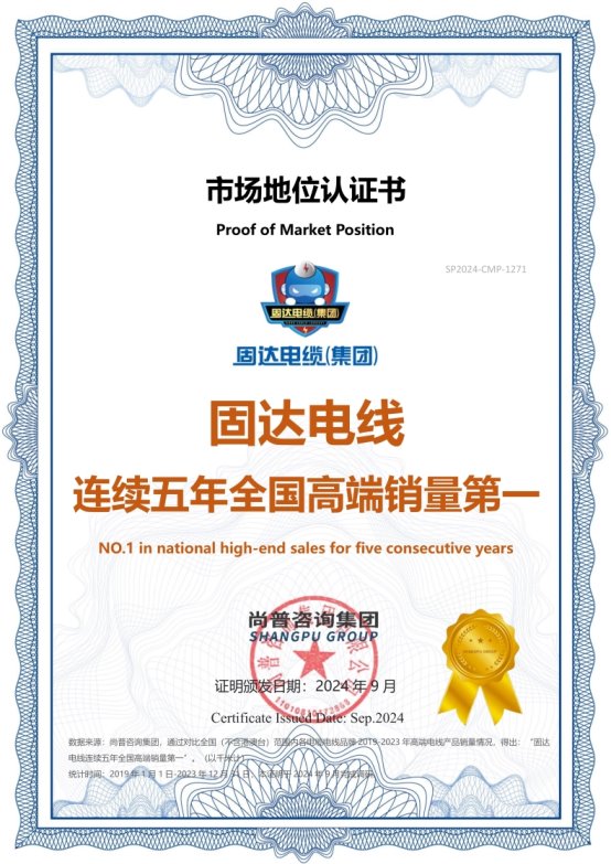 2024年12月,尚普咨詢集團在中國貴州安順舉辦的固達電線連續(xù)五年全國高端銷量第一發(fā)布儀式上向固達電線頒發(fā)市場地位認證書。此次固達電線榮獲尚普咨詢【固達電線連續(xù)五年全國高端銷量第一】認證,標志著固達電線在我國高端電線行業(yè)中領(lǐng)導(dǎo)地位的認定及市場的高度認可。