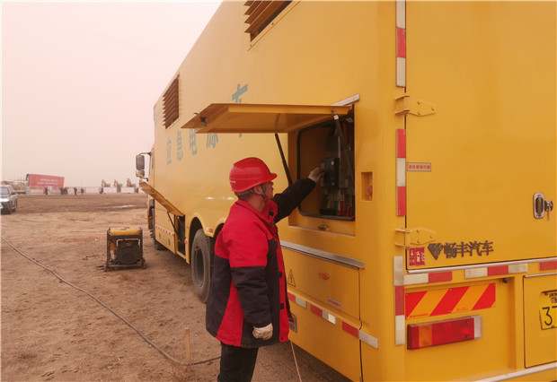 開工儀式當(dāng)天沙塵天氣持續(xù),揚(yáng)沙隨風(fēng)彌漫,突擊隊(duì)的保電人員不辭辛苦一大早便提前進(jìn)入會(huì)場。將發(fā)電車停靠在前期查勘的指定位置,做好安全監(jiān)護(hù)相關(guān)的工作之后,啟動(dòng)車輛試運(yùn)行,檢查了各項(xiàng)儀表數(shù)據(jù),并做好與用戶側(cè)供電設(shè)備的對(duì)接,全力以赴投入保電工作。該分局領(lǐng)導(dǎo)帶領(lǐng)保電人員全程守候在現(xiàn)場,隨時(shí)應(yīng)對(duì)突發(fā)停電事故的發(fā)生,確保了開工儀式用電萬無一失。