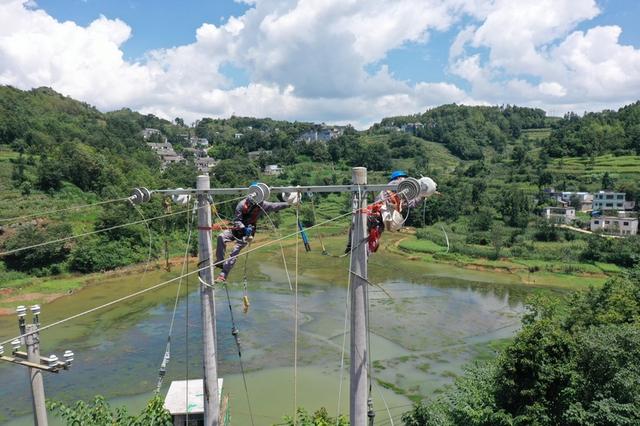 南方電網(wǎng)興仁供電局工作人員對新田水庫10千伏龍麻線新田支線線纜進行緊線操作。