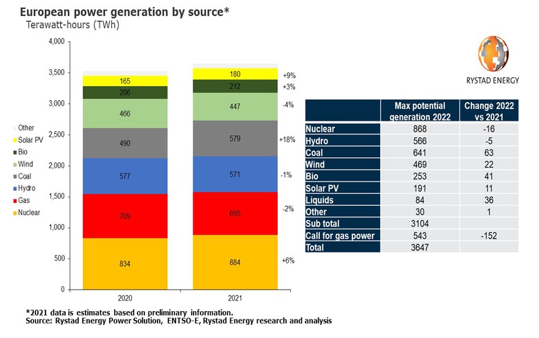 根據(jù)Rystad Energy的研究,去年歐洲的燃煤發(fā)電量從2020年增長18%至579 TWh,中斷了自2012年以來的下降趨勢。