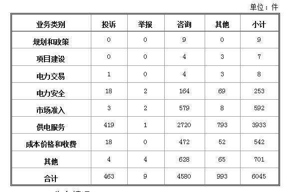 投訴舉報主要集中在電力行業(yè),共472件。從業(yè)務(wù)分類情況看,電力交易方面1件,占0.21%;電力安全方面20件,占4.24%;市場準(zhǔn)入方面5件,占1.06%;供電服務(wù)方面420件,占88.98%;成本價格和收費(fèi)方面18件,占3.81%;其他方面8件,占1.69%。(2018年1月電力行業(yè)有效信息按業(yè)務(wù)分類情況見表二)