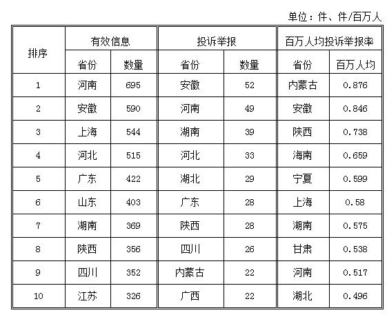 2018年1月,各?。ㄗ灾螀^(qū)、直轄市)按照有效信息數(shù)量排序,河南、安徽、上海等?。ㄊ校┝腥珖?0位;按照投訴舉報數(shù)量排序,安徽、河南、湖南等省排在全國前10位;按照百萬人均投訴舉報率排序,內(nèi)蒙古、安徽、陜西等省(自治區(qū))位于全國前10位。(2018年1月有效信息及投訴舉報排名前10位情況見表三)