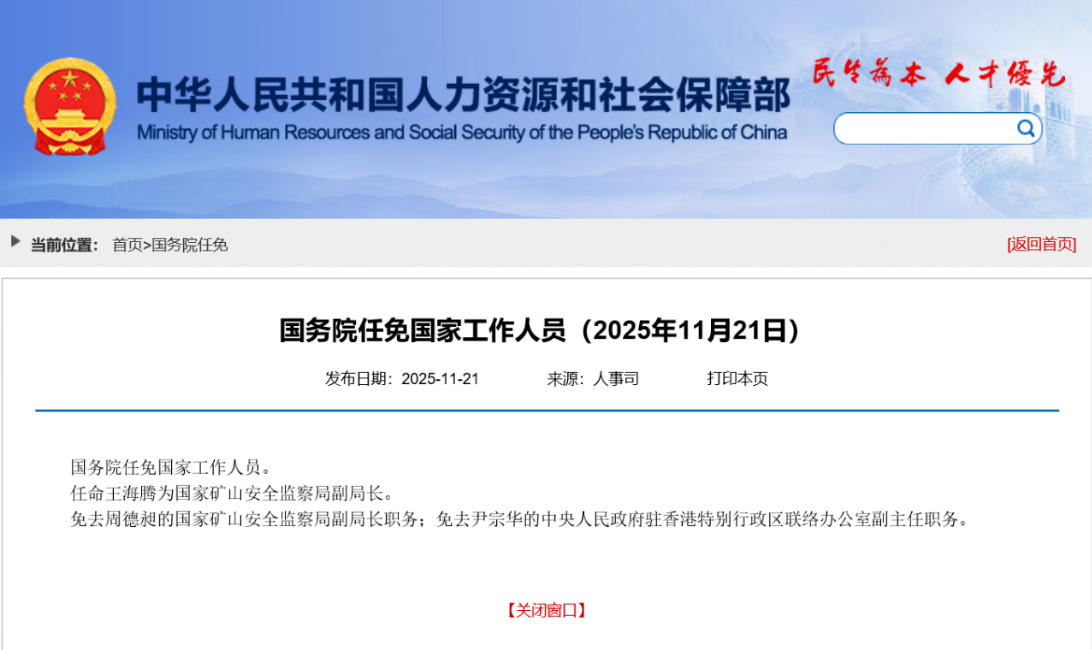 人社部網(wǎng)站11月21日消息:國(guó)務(wù)院任免國(guó)家工作人員。任命王海騰為國(guó)家礦山安全監(jiān)察局副局長(zhǎng)。
