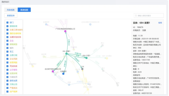 通過遠光軟件“知識圖譜應用平臺”的圖譜構建模塊,可以將審單過程中需要用到的各種實體融合到一張圖中,非常直觀的定義各類實體間的關系。再通過RPA或外部系統(tǒng)提供的數據接口,將實體所對應的具體數據導入,從而形成我們審單所需要的各類知識。單據中包含了哪些信息,哪些需要被重點關注,在圖中一目了然,真正做到了“哪里不清楚點哪里”。最后,將審單規(guī)則配置到圖譜中,就可以實現報銷單的自動審核。