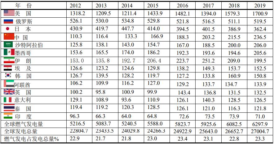 2019年全球燃?xì)獍l(fā)電量為6297.9TWh,比去年增長3.5%,其中美國占全球燃?xì)獍l(fā)電總量的27.0%、其次俄羅斯8.2%、日本5.8%,中國居第四為3.8%。
