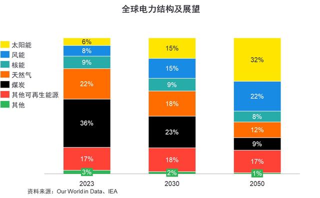 縱觀全球電力結(jié)構(gòu),2023年石油、煤炭和天然氣三大傳統(tǒng)能源仍占主導(dǎo)地位,占比高達(dá)61%,可再生能源占比約為39%,其中太陽能發(fā)電僅占6%。全球電力結(jié)構(gòu)正面臨深刻變革,根據(jù)國(guó)際能源署(IEA)預(yù)測(cè),到2030年,傳統(tǒng)能源發(fā)電主導(dǎo)地位受到挑戰(zhàn);到2050年,可再生能源將成為電力結(jié)構(gòu)的主力軍,占比高達(dá)79%,其中太陽能發(fā)電預(yù)計(jì)將達(dá)到32%。